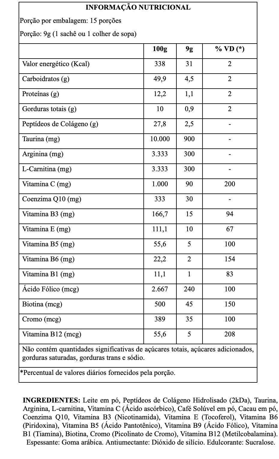 A fórmula contém 2.500mg de Peptídeos de Colágeno e Biotina. Estudos mostram que o uso contínuo a partir de 4 semanas já apresenta melhoras na hidratação da pele e fortalecimento de unhas e cabelos.